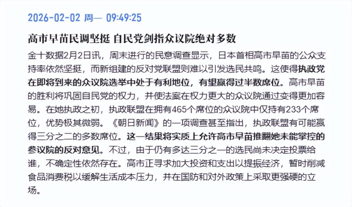 这无疑为高市早苗的政治野心提供了有力支撑。若胜选,高市早苗将彻底摆脱执政联盟的掣肘,告别以往依赖外部支持的脆弱局面,拥有稳固的政权基础,后续推行各类政策的话语权和执行力将大幅提升。