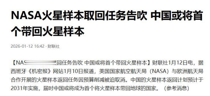 就在今年1月,美国刚刚掐了NASA火星采样返回项目的预算,那意味着美国主动放弃了一项原本全球领先的科研工艺。